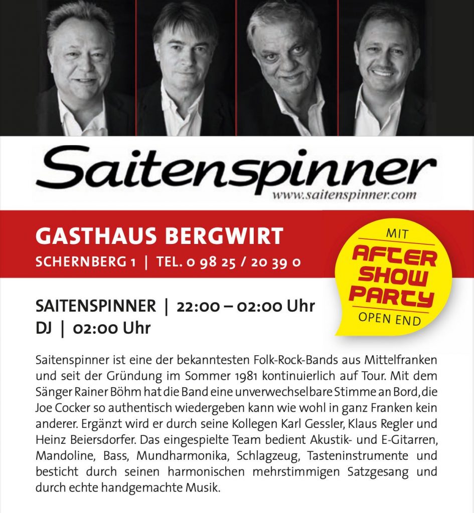 HERRIEDEN (dco)- Neue Gesichter sieht man selten bei so alteingesessenen und erfahrenen Bands wie den Saitenspinnern aus Ansbach. Die Coverrockband aus Mittelfranken gilt als Urgestein in der Szene. Selbst nach Jahrzehnten gibt die Altherrenriege noch Vollgas, so dass manche Newcomer dagegen verblassen.