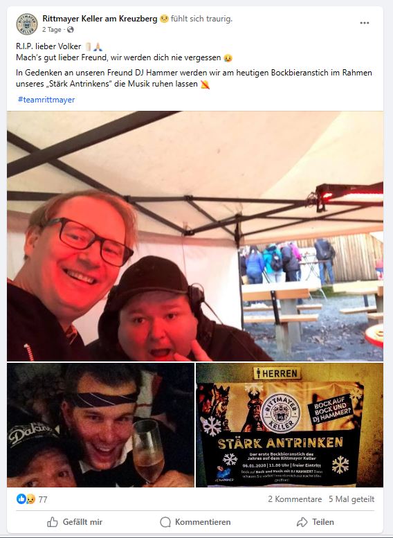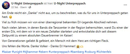 Bei all seinen Karriereavancen (Radio Bamberg, Bamberger Sandkerwa, Breitengüßbacher Plattenparty, BRK Rosenmontagsball usw.) ist DJ Hammer also immer Mensch geblieben. Freundlich und zuvorkommend, keineswegs abgehoben zu seinen Mitmenschen, aber auch immer begeistert von der Musik, mit der er gute Laune verbreitete. Kein Wunder also wenn Veranstalter ihm auf seinem letzten Weg jetzt Respekt zollen. Der Rittmayer Keller in Hallerndorf ließ am Samstag beim Bockbieranstich die Musik ihm zu Ehre ruhen.