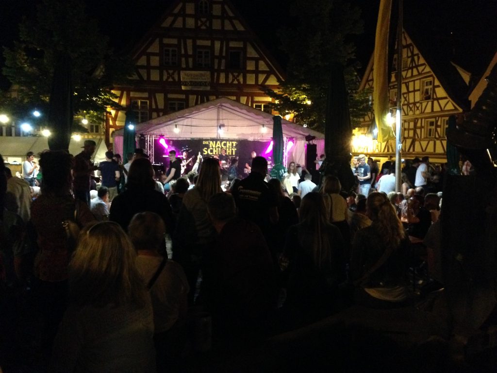 Der Schlosshof/Kirchenplatz: Die Band ist eigentlich längst fester Bestandteil des Altstadtfestes. Nur musste man meist ein paar Schritte weiter gehen, um ihr zu folgen. Unter dem Torborgen, vorbei am Ratskeller im Schlosshof vor dem Rathaus heizte die Herzogenauracher Band den Besuchern mit rockigen Klängen so richtig ein. Außerdem musste man zur richtigen zewit am richtigen Ort sein. Das Zeitfenster für die Auftritte hat Festivalcharakter (meist 1,5-2 Std.). Nur so konnte die Musikinitiative Herzogenaurach- ein Verein der heuer sein 25 jähriges Bestehen gefeiert hätte- aber auch die ganze Vielfalt ihrer „Pferde im Stall“ repräsentieren. Viele aktive Mitglieder und Musiker sind mittlerweile weit über die Grenzen Herzogenaurachs bekannt (beispielsweise Rocktide). Seit letztem Jahr musste die Musikinitiative baustellenbedingt auf den Kirchenplatz ausweichen.