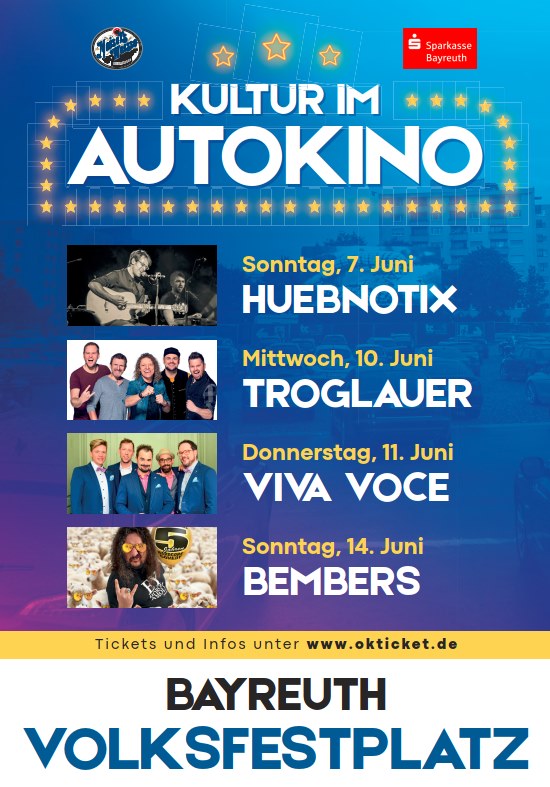 Diese Regeln, die immer zur fünften Jahreszeit in Bayreuth gelten, sind momentan außer Kraft gesetzt. Dort wo sich sonst an 11 Tagen dutzende von Besuchern tummeln, reiht sich Auto an Auto. Filme gucken statt großem Rummel lautet die Devise, seit das Autokino hier (s)einen Standort eröffnet hat. Ab kommender Woche bebt der Volksfestplatz zeitweilig dann aber doch wieder. Mit Huebnotix, den Troglauer Buam, A capella Band Viva Voce und Comedian Bembers startet die Kulturoffensive im Autokino. Die Troglauer Buam geben am 10 Juni ihr einziges Konzert in bayreuth. Der Auftritt auf dem Maisel’s Weißbierfest wurde ja aus den allseits bekannten Gründen abgesagtt.