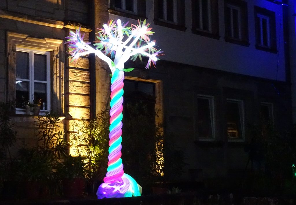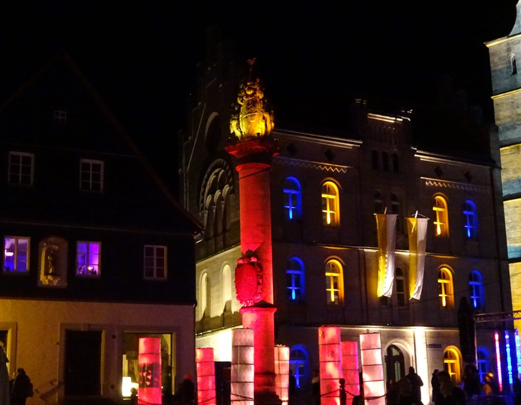 Schon wieder zu spät. Unser Zeitmanagement ist wirklich unter aller Sau. Aber wir können uns gar net entscheiden, wo wir heut als erstes hinwollen. Alles hier strahlt in den schönsten Farben. Erkennt sogar der ADAC an. Kronach leuchtet gehört laut dem Allgemeinen Deutschen Automobilclub zu den schönsten Lichterfesten der Welt