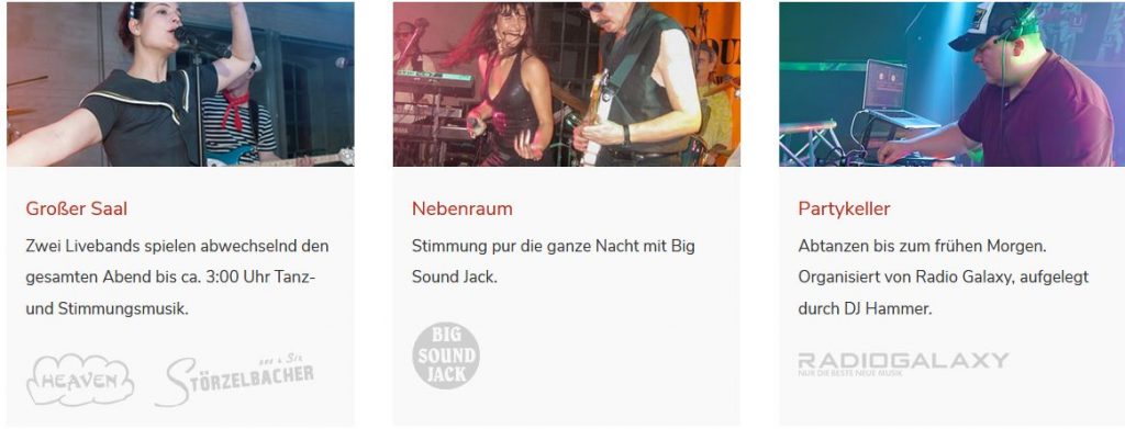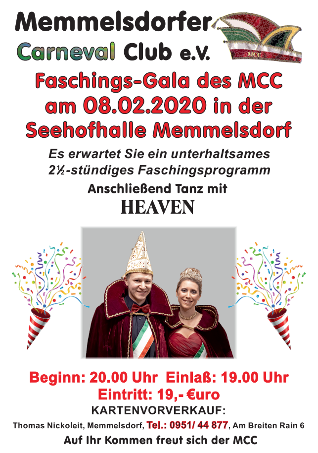 Auch im 56 Jahr ihres Bestehens wollte der Memmelsdorfer Carneval Club e.V. nicht auf die ausgezeichnete Band aus Unterfranken verzichten. Damit die Vorfreude aber auch noch vor Ort erhalten bleibt, erwartet die Gäste erstmal ein 2 1/2 stündiges buntes Faschinsgprogramm. Erst danach kann man zusammen mit Heaven so richtig die Sau raus lassen.