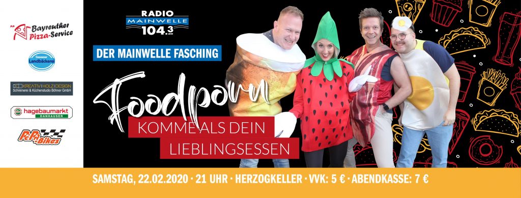 Was kommt denn da heute im Herzogkeller auf den Teller? Stammgäste des beliebten Biergarten in Bayreuth sollten sich nicht wundern. Am Faschingssamstag übernimmt wieder Radio Mainwelle das Zepter und fordert die Besucher unter dem Motto „Food Porn“ bei der großen Mainwelle Faschingsparty auf ich selbst in sein „Lieblingsessen“ zu verwandeln. Wir erwarten alles von Fast Food über leckere „Früchtchen“ (Ananas, Kiwi, Tomate etc.), von herzhaften Pizzen bishin zu süßen Verführungen. DJ Matt Synder sorgt ab 21 Uhr dafür, dass jede Kalorienbombe auch das Tanzbein schwingen kann.